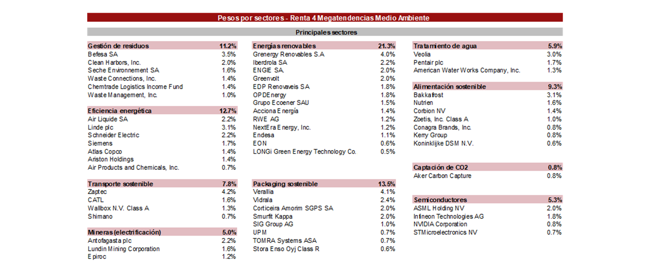 Actualmente, la cartera está compuesta por 56 compañías, donde los 6 principales subsectores representan el 76% del patrimonio: energías renovables (21,3%), packaging sostenible (13,5%), eficiencia energética (12,7%), alimentación sostenible (9,3%), gestión de residuos (11,2%) y tratamiento de agua (5,9%).