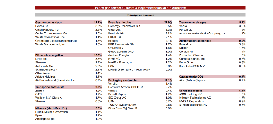 Actualmente, la cartera está compuesta por 56 compañías, donde los 7 principales subsectores representan el 86% del patrimonio: energías renovables (21,9%), packaging sostenible (14,1%), eficiencia energética (13,8%), gestión de residuos (11,1%), alimentación sostenible (9,9%), transporte sostenible (9,0%) y tratamiento de agua (5,7%).