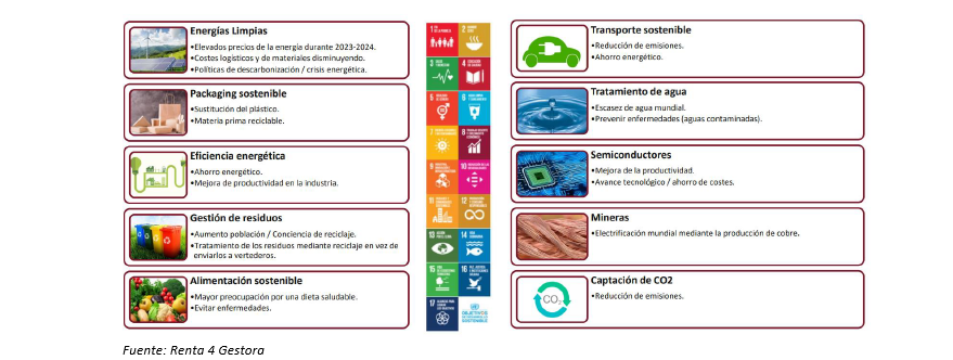 Como podéis observar en la siguiente imagen Renta 4 Megatendencias Medio Ambiente invierte en sectores que cumplen con alguno de los Objetivos de Desarrollo Sostenible (ODS) de las Naciones Unidas.