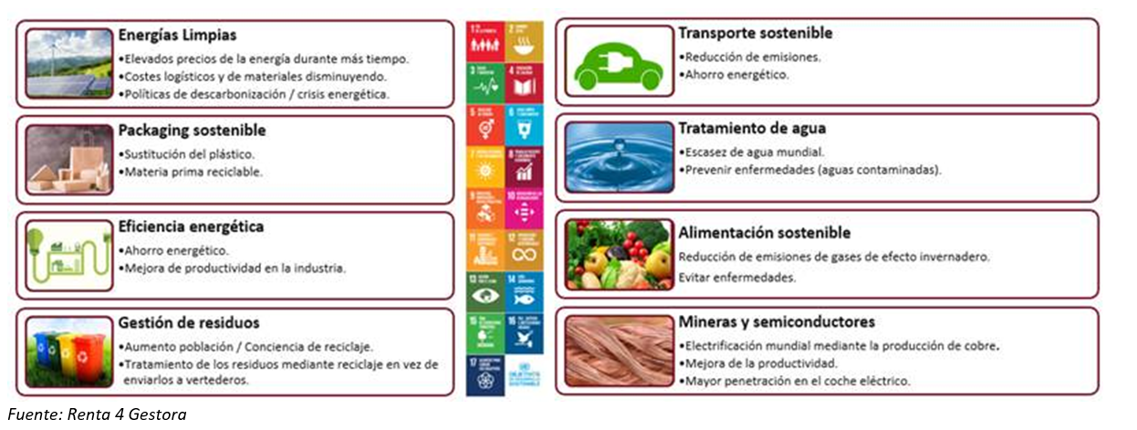 Como podéis observar en la siguiente imagen Renta 4 Megatendencias Medio Ambiente invierte en sectores que cumplen con los Objetivos de Desarrollo Sostenible (ODS) de las Naciones Unidas.