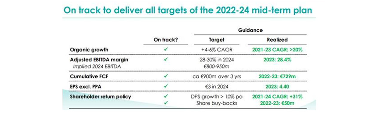 Como primera posición del fondo, continuamos confiando en Verallia (4.200 millones de euros de capitalización). Líder europea en la producción de envases de vidrio, está presente en 12 países con 34 plantas de producción. Desde su salida a bolsa en 2019, sus ingresos han crecido un 51% hasta 3.904 millones de euros en 2023 y su beneficio operativo (EBITDA) un 82% hasta 1.108 millones de euros, lo que la sitúa como la compañía del sector con los mejores márgenes con un 28,4%. A pesar de haber superado con creces las expectativas, su cotización sólo ha subido un 22%.