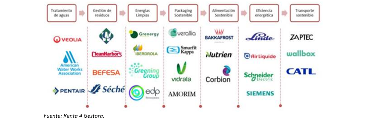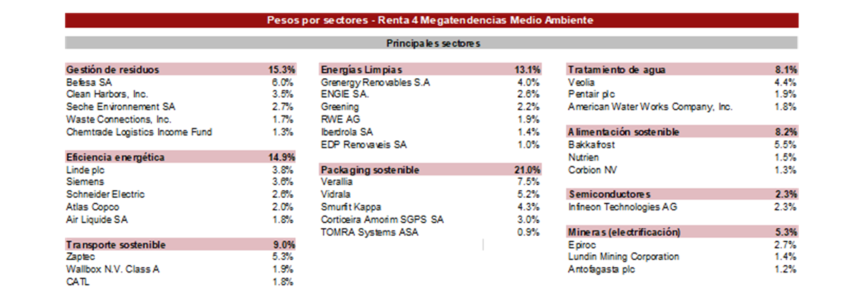 Actualmente, los 7 principales subsectores de la cartera representan el 90% del patrimonio: packaging sostenible (21%), gestión de residuos (15%), energías limpias (13%), eficiencia energética (15%), transporte sostenible (9%), alimentación sostenible (8%) y tratamiento de agua (8%).