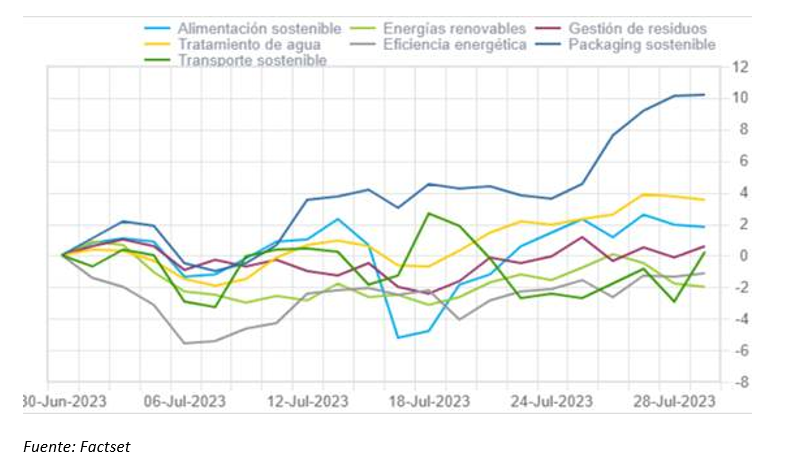 La exposición neta a renta variable del fondo se sitúa en el 93,6% (frente al 94,2% en junio de 2023). Este mes, hemos incrementado posición en compañías de alta calidad y con grandes perspectivas de crecimiento a medio y largo plazo como Pentair (tratamiento de agua industrial), Bakkafrost (alimentación sostenible), Zaptec (cargadores para coche eléctrico) y Befesa (gestión y tratamiento de residuos). Por el lado de las ventas, hemos dado salida a Air Products (gases industriales) para concentrar nuestra posición en este nicho en compañías que consideramos más interesantes, como Linde y Air Liquide.