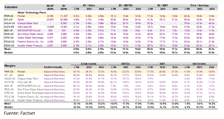 Por todo ello, hemos aumentado su peso en la cartera con Pentair (11,5Bn$ de capitalización), compañía estadounidense que se dedica a la manufactura de productos para el uso eficiente y tratamiento del agua. Cuenta con unos márgenes EBIT superiores al 20% y una conversión en caja elevada (FCF/EBITDA>60%). Además, es una compañía con un bajo nivel de deuda (ratio DFN/EBITDA inferior a 2x).
