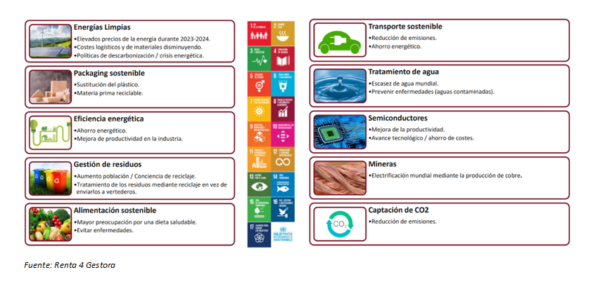 Como podéis observar en la siguiente imagen Renta 4 Megatendencias Medio Ambiente invierte en sectores que cumplen con los Objetivos de Desarrollo Sostenible (ODS) de las Naciones Unidas.