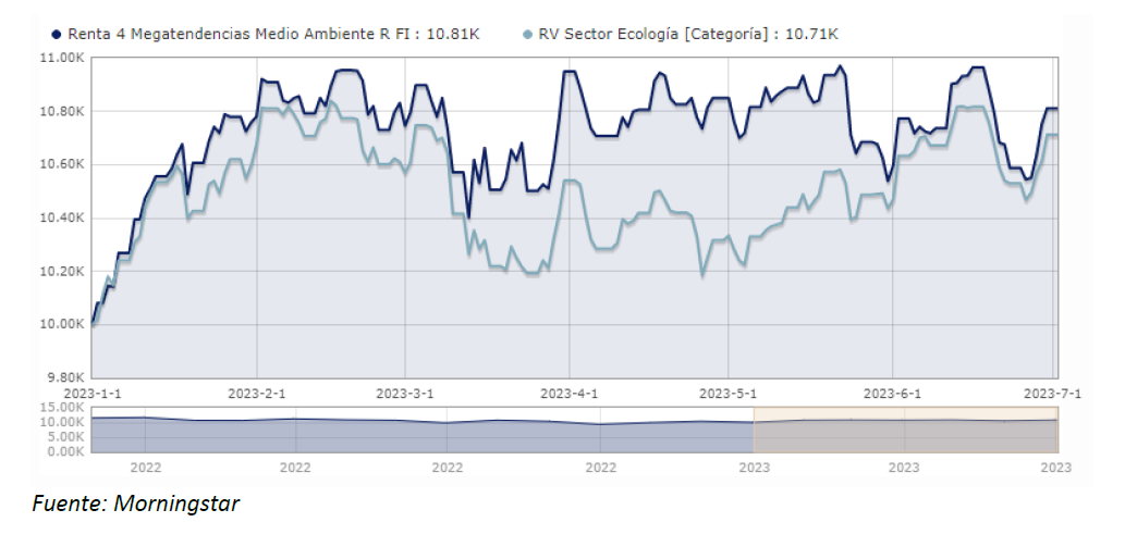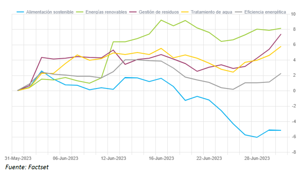 En el mes de junio el fondo ha obtenido una rentabilidad del +2,6% y +8,1% en lo que llevamos de año, por encima de su categoría (+7,1% en el año de RV Sector Ecología). Seguimos apostando por la diversificación geográfica y sectorial, lo que nos permite aprovechar las ineficiencias de corto plazo e invertir en los mejores subsectores en cada momento.