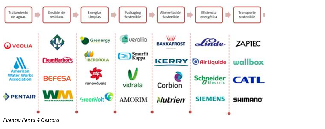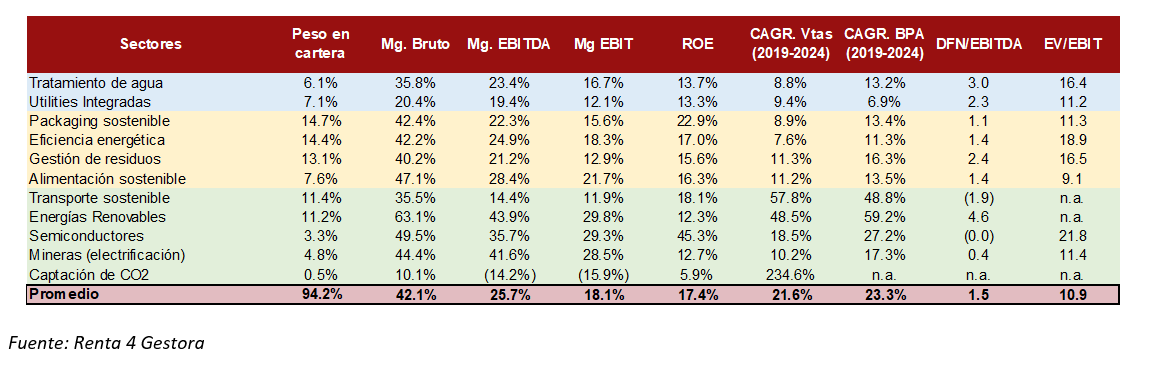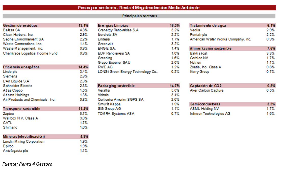 Actualmente, la cartera está compuesta por 47 compañías, donde los 7 principales subsectores representan el 86% del patrimonio: energías limpias (18%), packaging sostenible (15%), eficiencia energética (14%), gestión de residuos (13%), alimentación sostenible (8%), transporte sostenible (11%) y tratamiento de agua (6%).