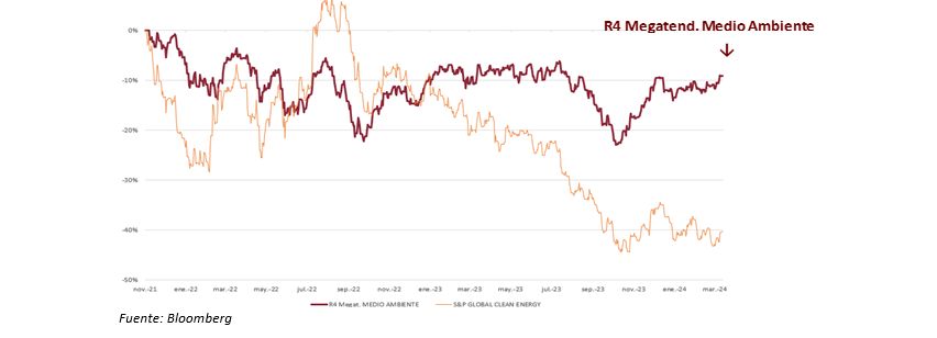 Renta 4 Megatendencias Medio Ambiente se revaloriza un +3,5% en marzo de 2024 (vs. +0,4% S&P Global Clean Energy). Pese a un contexto complicado en los últimos años desde el lanzamiento del fondo, con un entorno de tipos de interés elevados, volatilidad en los precios energéticos y debilitamiento macroeconómico, creemos que el mercado nos brinda, actualmente, una oportunidad única de entrada en unos sectores con gran potencial a múltiplos muy atractivos.