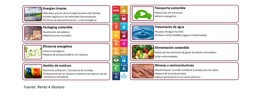 Como podéis observar en la siguiente imagen Renta 4 Megatendencias Medio Ambiente invierte en sectores que cumplen con los Objetivos de Desarrollo Sostenible (ODS) de las Naciones Unidas.