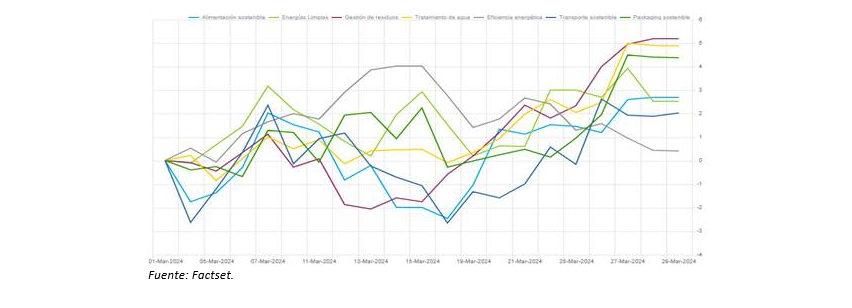 Durante el mes de marzo, el sector que ha obtenido un mejor comportamiento ha sido el de gestión de residuos junto con el de tratamiento de agua, mientras que los que han aportado una menor rentabilidad han sido los sectores de eficiencia energética y transporte sostenible.
