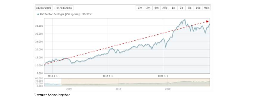 En el siguiente gráfico mostramos la evolución de la categoría sector ecología en los últimos 15 años, donde independientemente del mal comportamiento en los últimos 2-3 años (lanzamiento del fondo Renta 4 Megatendencias Medio Ambiente), la evolución en el largo plazo ha sido muy positiva (rentabilidad anualizada del 9% y del 265% acumulada).