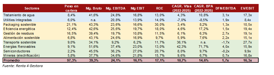 A continuación, mostramos algunos ratios de la cartera, desglosándolos por sectores. Asimismo, hemos agrupado estas temáticas en 3 subgrupos sectoriales donde podemos observar que, en su conjunto, es una cartera con un promedio de márgenes elevados, atractivos crecimientos y bajo nivel de apalancamiento.