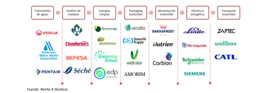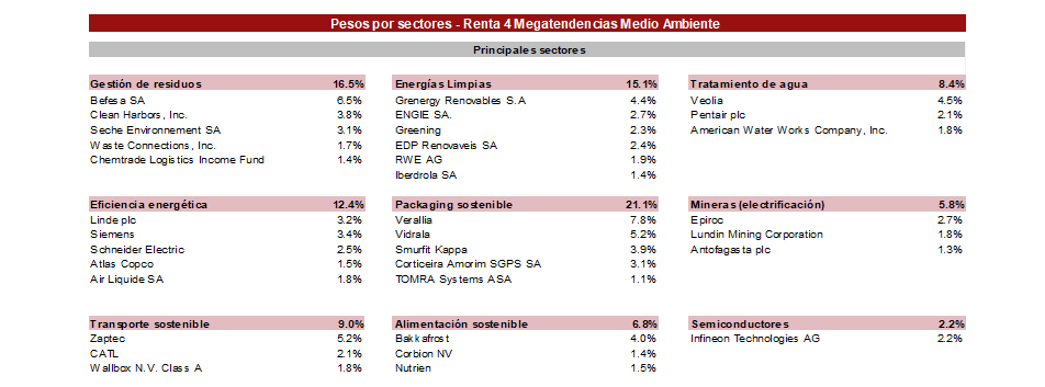 Actualmente, los 7 principales subsectores de la cartera representan el 89% del patrimonio: packaging sostenible (21%), gestión de residuos (16%), energías limpias (15%), eficiencia energética (12%), transporte sostenible (9%), alimentación sostenible (7%) y tratamiento de agua (8%).