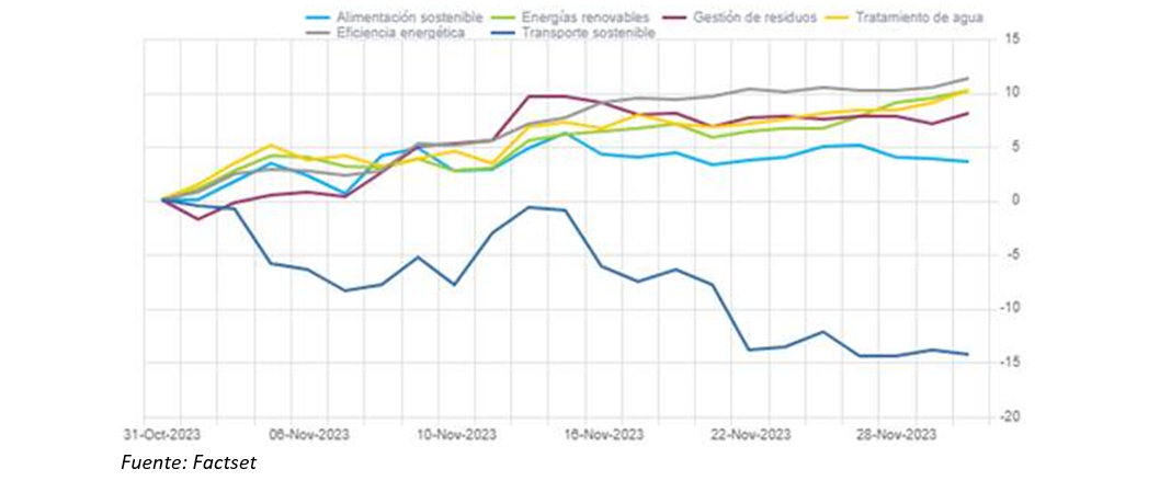 Los sectores que han obtenido un mejor comportamiento durante el mes de noviembre han sido los de eficiencia energética, energías renovables y tratamiento de agua, mientras que el de transporte sostenible ha sido el que ha tenido una peor evolución, debido a las fuertes caídas dentro del sector cargadores para coche eléctrico (Zaptec -20,6% y Wallbox -11,8%) tras indicadores de ralentización de la demanda de coche eléctrico durante los últimos meses.