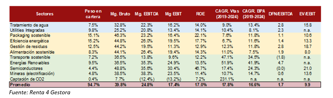 Actualmente, la cartera está compuesta por 44 compañías, donde los 7 principales subsectores representan el 85% del patrimonio: energías limpias (19%), packaging sostenible (15%), eficiencia energética (15%), gestión de residuos (13%), alimentación sostenible (8%), transporte sostenible (7%) y tratamiento de agua (7%).