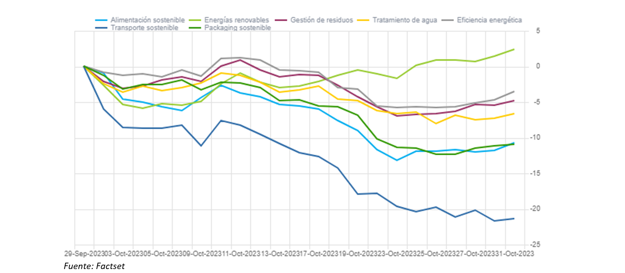 En lo que llevamos de mes, la rentabilidad del fondo cae un 7,5%. Los sectores que han obtenido un mejor comportamiento han sido el de Energías renovables (impulsado por Greenvolt +18,3% y Grenergy +8,5%), mientras que el de Transporte sostenible ha sido el que ha tenido una peor evolución, debido a las fuertes caídas dentro del sector cargadores para coche eléctrico (Zaptec -22,5% y Wallbox -30,2%) tras indicadores de ralentización de la demanda de coche eléctrico durante los últimos meses. En el mes de octubre, el fondo ha tenido un peor comportamiento relativo respecto a su categoría (-6,1%) debido al relevante peso que tenemos en el sector Transporte sostenible (9%).