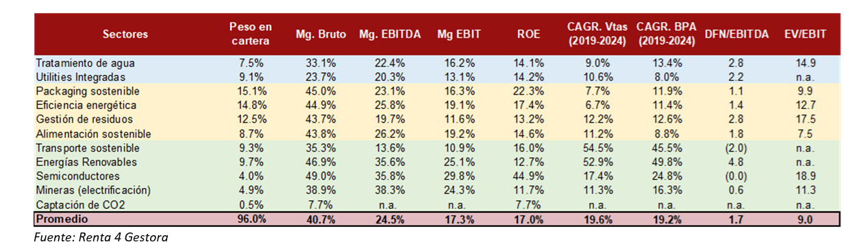 Actualmente, la cartera está compuesta por 44 compañías, donde los 7 principales subsectores representan el 87% del patrimonio: energías limpias (19%), packaging sostenible (15%), eficiencia energética (15%), gestión de residuos (13%), alimentación sostenible (9%), transporte sostenible (9%) y tratamiento de agua (7%).