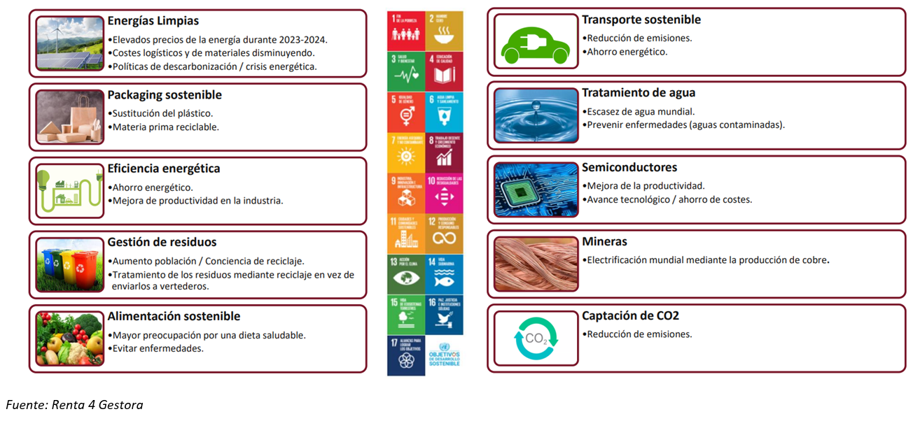 Como podéis observar en la siguiente imagen Renta 4 Megatendencias Medio Ambiente invierte en sectores que cumplen con los Objetivos de Desarrollo Sostenible (ODS) de las Naciones Unidas.