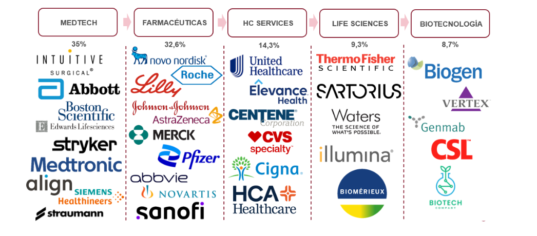 Con un nivel de inversión ligeramente del 97% mantenemos una cartera diversificada de 62 valores + 1 ETF de biotecnología, formando así parte de toda la cadena de valor que forma el sector salud, con mayor peso en aquellas áreas de mayor crecimiento, que nos permiten capturar retornos atractivos de doble dígito ya que invertimos en compañías estables, de calidad, con ingresos recurrentes y elevada generación de caja. Esto nos permite diferenciarnos de otros fondos y posicionarnos con retornos por encima de la media de la categoría de fondos de salud en todos los plazos.