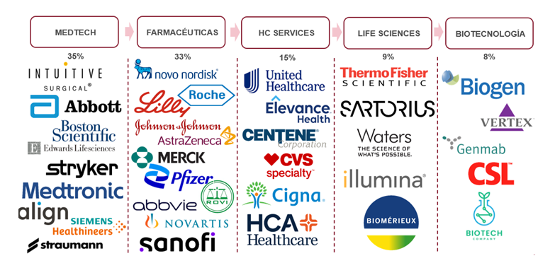 Con un nivel de inversión cercano al 95% mantenemos una cartera diversificada de 62 valores + 1 ETF de biotecnología, formando así parte de toda la cadena de valor que forma el sector salud, con mayor peso en aquellas áreas de mayor crecimiento, que nos permiten capturar retornos atractivos de doble dígito ya que invertimos en compañías estables, de calidad, con ingresos recurrentes y elevada generación de caja. Esto nos permite diferenciarnos de otros fondos y posicionarnos con retornos por encima de la media de la categoría de fondos de salud en todos los plazos.