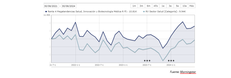 El fondo Renta 4 Megatendencias Salud acumula en el primer semestre del año una rentabilidad del +6,3%, siendo la subida del mes de junio del +1,3%, comportamiento ligeramente inferior respecto a los principales índices del sector (MSCI World Healthcare, SPDR Healthcare Selector y S&P Healthcare) en el mismo periodo y divisa. Desde su lanzamiento en febrero de 2020 la rentabilidad acumulada es del +28% que supone un +5,8% de rentabilidad anualizada.