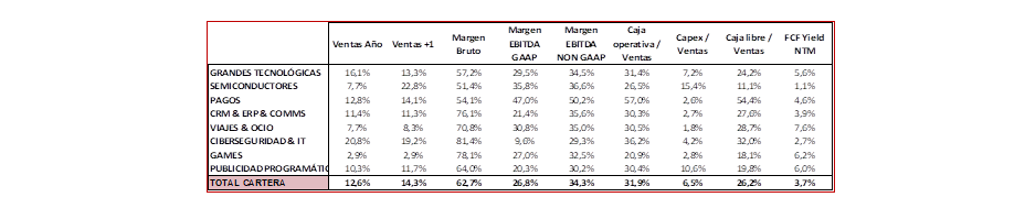 Para finalizar, respecto a las empresas en cartera, el crecimiento medio esperado en ventas para este FY24 es de un +14% yoy, con un margen EBITDA Ajustado esperado del 34,5% de media para este FY24. Por valoración, la cartera está a 18,6x EBITDA NTM con un FCF Yield NTM del 3,7%.