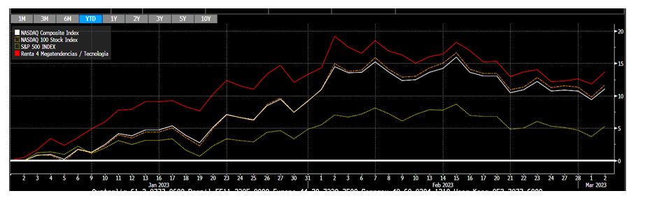 Renta 4 Megatendencias Tecnología cierra febrero con una ganancia por encima del doble dígito en el año (+12,8%), manteniendo una rentabilidad superior a los principales índices americanos, Nasdaq (10,7% en EUR) o S&P500 (4,7% en EUR). Respecto al mes de febrero estanco, el fondo ha caído ligeramente un -0,6%, algo peor que el -0,07% en EUR del S&P500 y de la subida del 1,4% en EUR del Nasdaq.