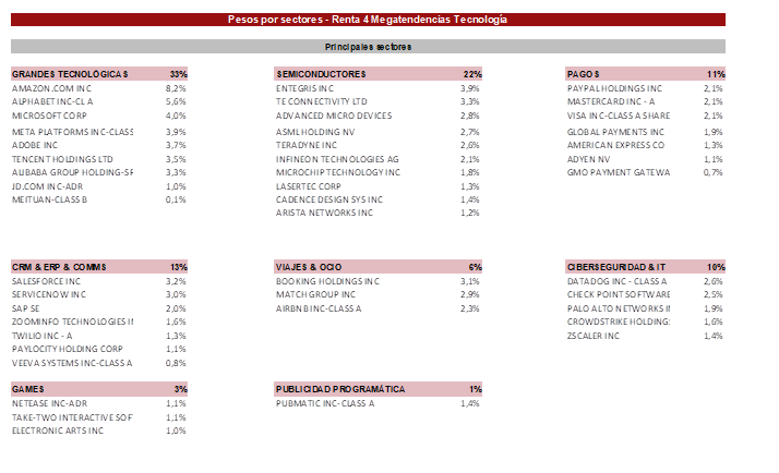 Renta 4 Megatendencias Tecnología Clase R ha generado una revalorización neta en el primer semestre de un 28,4%, ligeramente inferior al 29,2% del Nasdaq en EUR y muy por encima del 15,9% del S&P500 en EUR. Durante el mes de junio el fondo ha subido un 2,9% frente al 3,9% del Nasdaq.