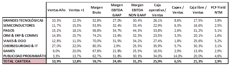 Para finalizar, respecto a las empresas en cartera, el crecimiento medio esperado en ventas para este FY23 es de un +10,9% yoy y +12,8% yoy para FY24, con un margen EBITDA Ajustado esperado del 31% de media para este FY23. Por valoración, la cartera está a 18xEBITDA NTM con un FCF Yield NTM del 2,9%.