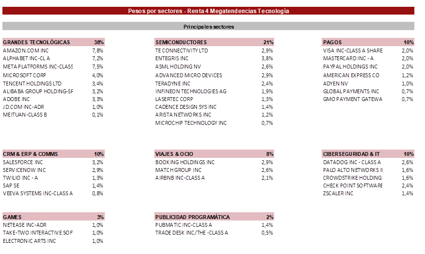 Renta 4 Megatendencias Tecnología Clase R se revaloriza un +24,8% en lo que llevamos de año hasta mayo, ligeramente superior al 24,4% del Nasdaq (en EUR) y claramente superior al 8,9% del S&P500 (en EUR). El mes mayo ha sido realmente bueno tras conseguir subir +10,1% frente al 9,7% del Nasdaq (en EUR) o el 0,25% del S&P500. Así, nuevamente nos situamos por delante en rentabilidad respecto al índice, ya que durante el mes de abril perdimos el Alpha que habíamos venido generando desde comienzos de año.