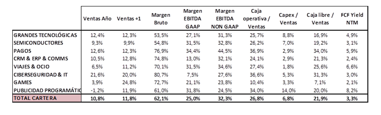 Para finalizar, respecto a las empresas en cartera, el crecimiento medio esperado en ventas para este FY23 es de un +11% yoy y +12% yoy para FY24, con un margen EBITDA Ajustado esperado del 32,3% de media para este FY23. Por valoración, la cartera está a 16x EBITDA NTM con un FCF Yield NTM del 3,3%.