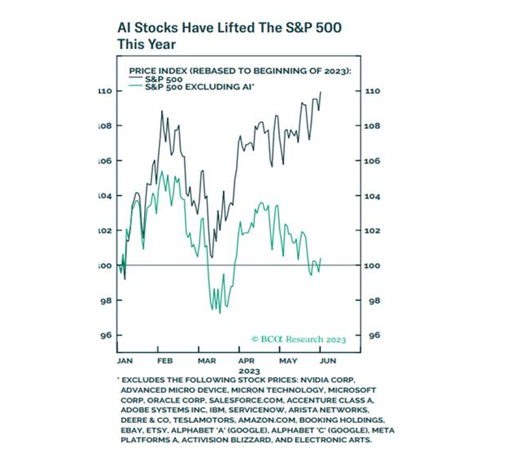 En mayo hemos visto caídas en las bolsas europeas (-3% en el caso del Eurostoxx) y no así en las americanas (+3% S&P500, +6% Nasdaq) aunque en este último caso han sido muy pocas compañías (aquellas relacionadas con la Inteligencia Artificial) las que han posibilitado este resultado. De hecho, como podemos ver en el gráfico, es llamativo la diferencia de comportamiento este año del S&P 500 (+10%) y de este mismo índice si excluimos empresas que se benefician de la nueva tecnología (+0%).
