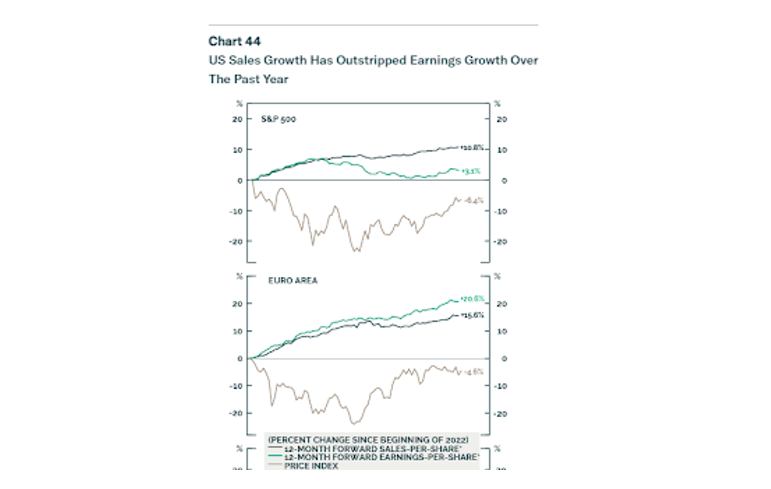 Aparte de la evolución de los resultados, el mercado está comprando un escenario benigno para los mercados financieros en los próximos meses: caída de la inflación y moderado crecimiento. Repito aquí lo que pusimos en el comentario del mes pasado y que me parece relevante.