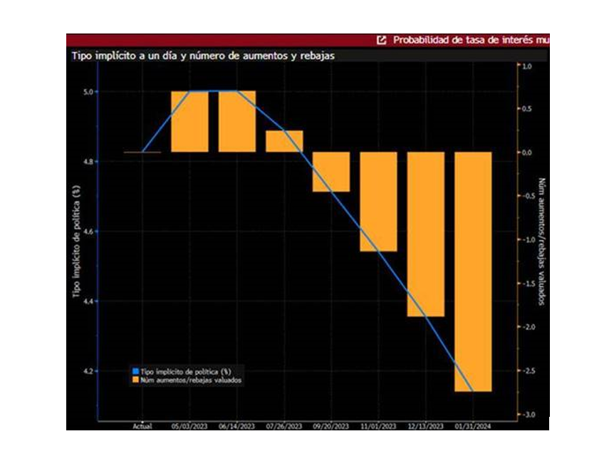 Hoy los mercados esperan bajadas de tipos en USA para el 2S23 (hasta niveles <4,2% el 31/01/2024) después de una subida más en el 2T23 (ver gráfico). En Europa, el BCE espera que la inflación termine el año en el 5,3% (desde el 6,3% que esperaba en diciembre) y la subyacente en el 4,6% (desde un previsión anterior del 4,2%). En 2024, su estimación es del 2,5%.