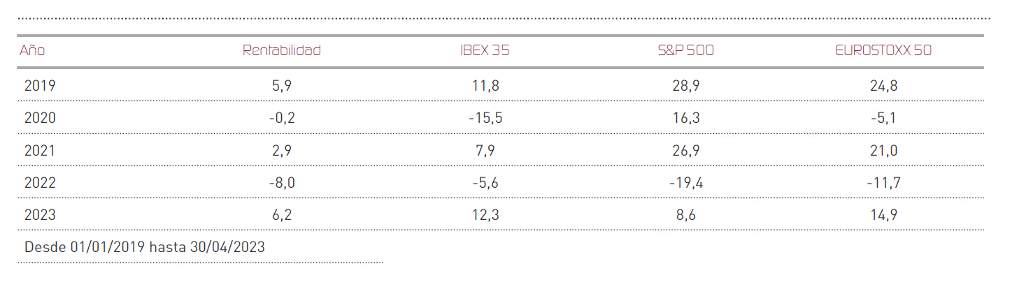 Renta 4 Renta Fija Mixto FI sumó un 1% en abril para acumular al cierre de abril una rentabilidad del +6,2%. Ha sido un mes que comenzó con subidas, apoyadas en el buen tono de los beneficios empresariales donde hemos conocido cifras de incrementos de facturación francamente buenas en términos generales, que han permitido a un gran número de compañías mantener sus márgenes a pesar del fuerte incremento de los costes. El principal foco de incertidumbre, sin embargo, ha sido la salud del sistema bancario regional americano que ha desembocado en la quiebra del californiano First Republic Bank y la intervención del Gobierno americano. En el mes, por tanto, los índices avanzaron en parte gracias a su comportamiento de su última sesión del mes: el Eurostoxx 50 sumó +1%, y los índices más globales avanzaron también con el SP500 +1,5% (-0,03% en euros) y MSCI World +1,6% (+0,1% en euros). El Ibex 35 por su parte sumó un 0,1%. Las bolsas consolidan así la trayectoria positiva mantenida en este primer cuatrimestre del año gracias a una economía que se está mostrando resistente y a unas compañías que se están viendo favorecidas por la resistencia de la demanda y la propensión de los consumidores a mantener su nivel de gasto, en un contexto de debilidad del dólar y tipos de interés que apuntan hacia el fin del actual ciclo de endurecimiento monetario.