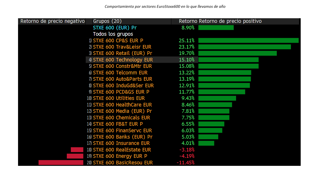 Sectorialmente, el rebote en Europa sigue distinguiéndose en 2023 por su fuerte componente rotacional. Las subidas han regresado a sectores como retail, ocio y viajes, tecnología o autopartes entre otros. Este giro se ha producido en detrimento del comportamiento de energía, inmobiliario o materiales. El cómputo global, no obstante, para nuestro fondo ha sido relativamente positivo debido a la buena diversificación de nuestra cartera, la exposición a compañías de viajes, bancos, semiconductores, lujo y renovables.