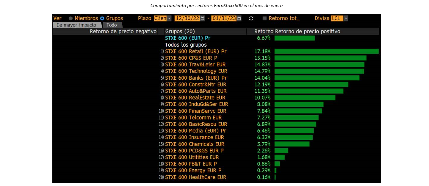 Particularmente, en este mes de enero estamos muy satisfechos del posicionamiento adoptado en renta variable, donde títulos por los que llevábamos tiempo apostando han capitaneado las subidas. Valores como Amadeus, Adidas, ASML o Meliá Hoteles han proporcionado una buena dosis de rentabilidad.