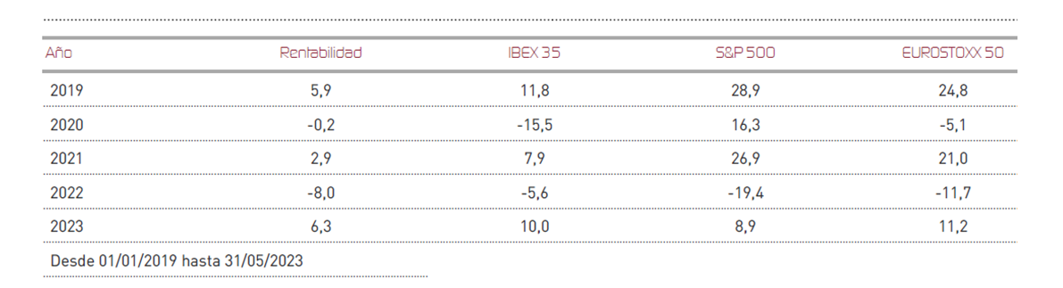 Renta 4 Renta Fija Mixto FI sumó un 0,1% en mayo, a pesar de los descensos en las bolsas europeas y en la bolsa española y acumula así en lo que llevamos de año una rentabilidad del +6,3%. Ha sido un mes donde los mercados han cotizado la preocupación por la falta de avances en las negociaciones sobre el techo de deuda americano, que amenazaba con una posible suspensión de pagos de imprevisibles consecuencias. La entrada en recesión técnica de Alemania, tras conocerse que su PIB se contrajo durante el primer trimestre un 0,3%, también añadió un factor de preocupación para las economías de la eurozona. Así, en el mes los índices recortaron modestamente aunque fueron capaces de salvaguardar las ganancias anuales de doble dígito: el Eurostoxx 50 descendió un 3,2% (+11,2% en el año), mientras que los índices más globales avanzaron espoleados por las previsiones favorables para el sector tecnológico gracias al auge de la Inteligencia Artificial. El SP500 +0,2% (+8,9% en el año) y MSCI World +2,4% (+7,6% en el año) recogieron con ganancias el tirón de algunas compañías que se beneficiarán de esta nuevo desarrollo tecnológico. El Ibex 35, por su parte, recortó un 2,1% afectado por los recortes en Europa y por el peor comportamiento del sector financiero. Las bolsas, mantienen así su recuperación a pesar de las dificultades (endurecimiento de las condiciones monetarias y sus consecuencias para el sistema bancario, incertidumbre económica, debilidad en China, etc.) gracias al mantenimiento de la actividad global del sector servicios y de la buena gestión que están realizando la mayor parte de las compañías.