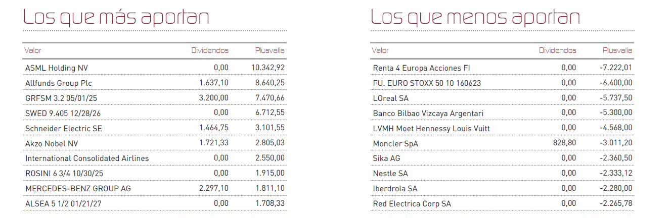 Por otro lado, el mayor aporte en el mes en renta variable ha venido de la mano de la IA, con la subida de nuestras acciones de ASML Holding, uno de los mayores participantes en la cadena de valor de los semiconductores que se necesitarán para esta nueva tecnología. También hemos disfrutado de las ganancias de Allfunds, que debería ir ganando mucha más altura debido a su fuerte infravaloración. También han sumado los títulos de Schneider, de Akzon Noble y de Mercedez Benz. En el lado negativo, hemos visto retroceder nuestra posición del fondo Renta 4 Europa Acciones y al sector del lujo, tras las buenas cotizaciones alcanzadas en lo que llevamos de año.