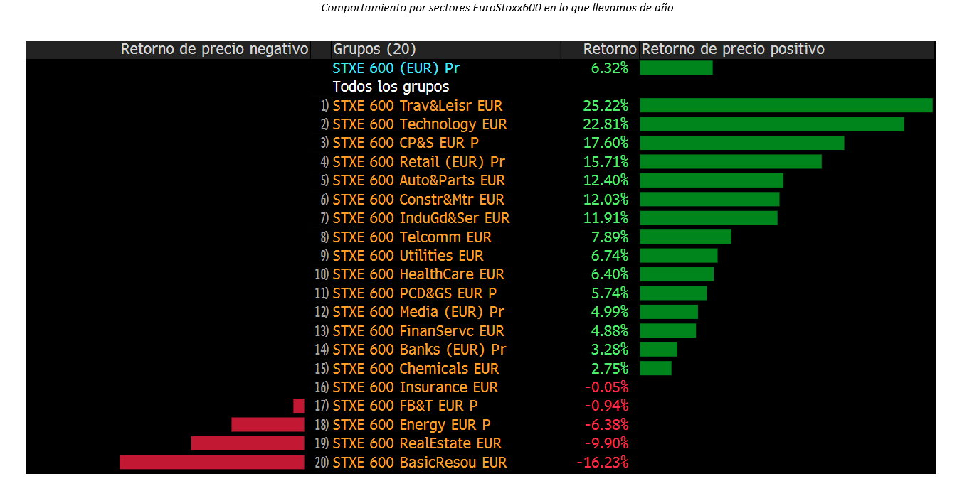 Sectorialmente, el rebote en Europa sigue distinguiéndose en 2023 por su fuerte componente rotacional. Las subidas han regresado a sectores como retail, ocio y viajes, tecnología o autopartes entre otros. Este giro se ha producido en detrimento del comportamiento de energía, inmobiliario o materiales. El cómputo global, no obstante, para nuestro fondo ha sido relativamente positivo debido a la buena diversificación de nuestra cartera, la exposición a compañías de viajes, bancos, semiconductores, lujo y consumo.