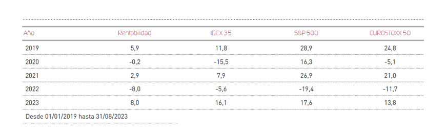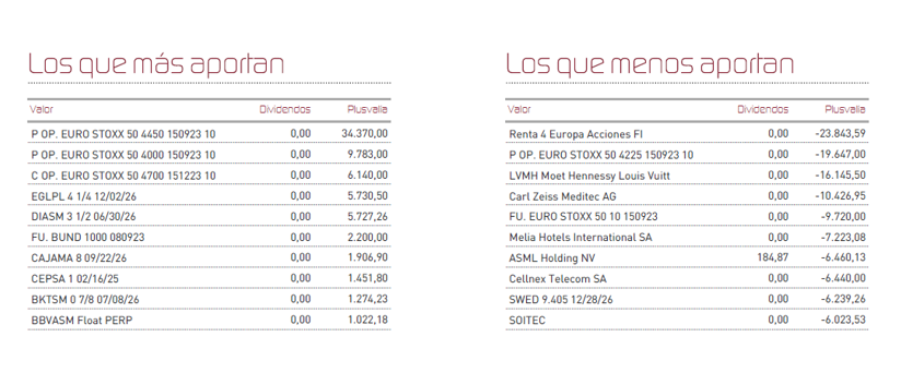 La cartera de renta fija consiguió brindar una aportación positiva durante el mes, a pesar de la presión en los precios de los bonos que trajo consigo la incertidumbre relacionada con la cita de Jackson Hole. A principios de mes hemos cerrado las posiciones largas en futuros de Bund, enfrentando así un menor riesgo de cara a final de año. En renta fija corporativa, durante el mes de agosto se ha observado una pequeñísima ampliación de diferenciales que, sin embargo, no cambia el panorama general de primas de riesgo muy contenidas, aunque el escenario de actual de tipos elevados se mantiene y permitirá a nuestro juicio seguir obteniendo rendimientos en lo que resta de año.
