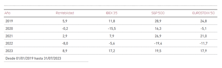 El año 2023 ha sorprendido a los inversores con un comportamiento muy alcista que parecía impensable en el mes de enero, lo que está provocando un cambio en el sentimiento de los inversores hacia un mayor optimismo. A la vista de ello, la experiencia nos dice que toca ser algo más prudentes y poner énfasis en aquellos títulos pertenecientes a los sectores más rezagados. Esperamos, por tanto, que nuestras coberturas sirvan para mantener protegido el beneficio acumulado, mientras esperamos que la cartera de renta fija sirva de motor para la rentabilidad en la segunda parte del año.