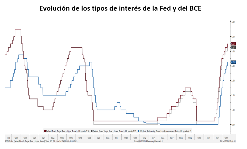 En renta fija, si bien las subidas de tipos no han permitido al mercado de bonos mostrar un mejor comportamiento, la drástica disminución de las primas de riesgo de crédito han marcado la tónica de los últimos tres meses, permitiendo un comportamiento sostenido de los precios. En los últimos compases del período, ha habido varios intentos de remontada de precios en los tramos de mayor duración, como consecuencia de esa expectativa de pausa en la actuación restrictiva de los bancos centrales para el mes de septiembre.