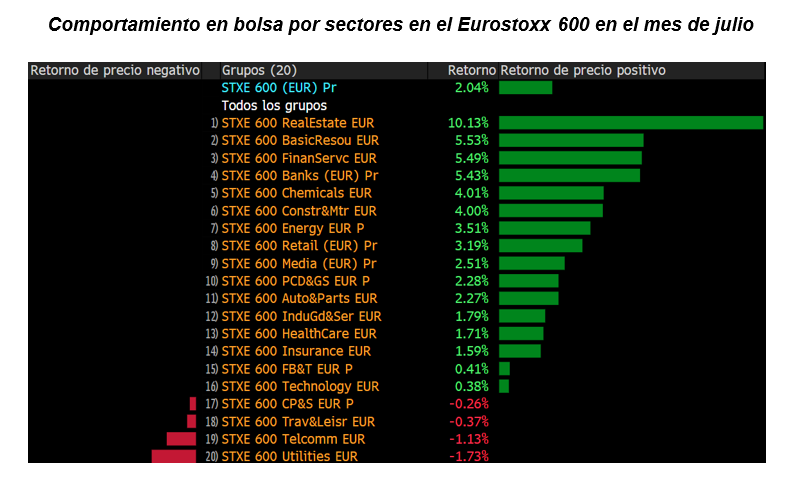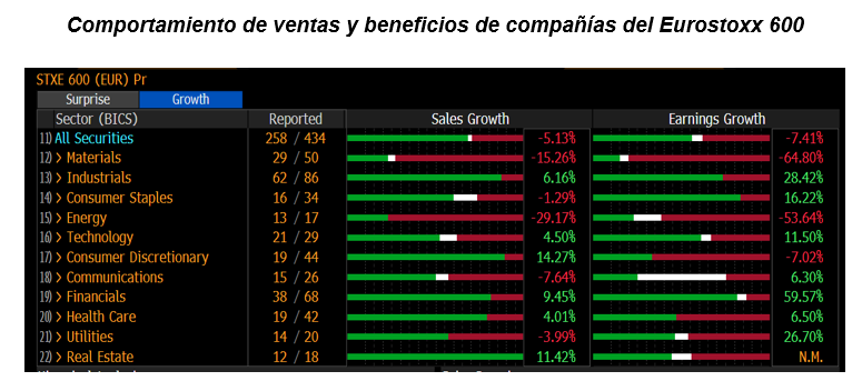 Estamos en mitad de la temporada de publicación de resultados del segundo trimestre, y se observa que los beneficios están aguantando mejor en Estados Unidos que en Europa, donde tras haber publicado aproximadamente el 59% de las empresas, los beneficios descienden un -7% interanual frente al -4% esperado, con ventas cayendo un 5% interanual. Si excluimos el sector energético el beneficio cae un -2%. Los sectores con mayor crecimiento de beneficios son financieras (+60% interanual), Industriales (+28%) y utilities (+27%). Los peores sectores en términos de beneficio son materiales (-65% yoy) y energía (-54% yoy).