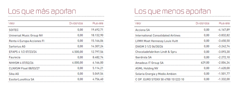 En renta variable, hemos practicado algunos cambios para adecuarnos al cambio de flujos que estamos observando en el mercado. Así hemos tomado beneficios en Universal Music, Amadeus, IAG, Meliá, y hemos eliminado nuestra posición en Faurecia, al tiempo que hemos reducido posición en Soitec. En su lugar hemos incorporado títulos con mejores perspectivas a medio y largo plazo, debido al atractivo de sus precios, como los títulos de Carl Zeiss, Cellnex, L’Oréal, Nestlé, Sartorius o Solaria.
