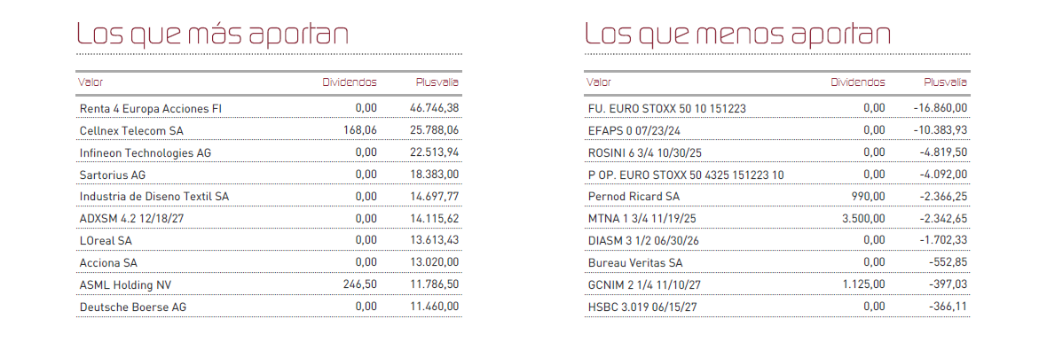 Por referencias, el fondo Renta 4 Europa acciones ha sido la posición que más nos ha aportado, debido a su fuerte ponderación y a su comportamiento positivo, pero también hemos asistido a una fuerte recuperación de algunas posiciones que venían lastrando durante el año, como Cellex, Sartorius, Acciona o ASML, mientras que otras, han mantenido la buena línea de todo el año, como Inditex, LOreal, o el bono de Audax.