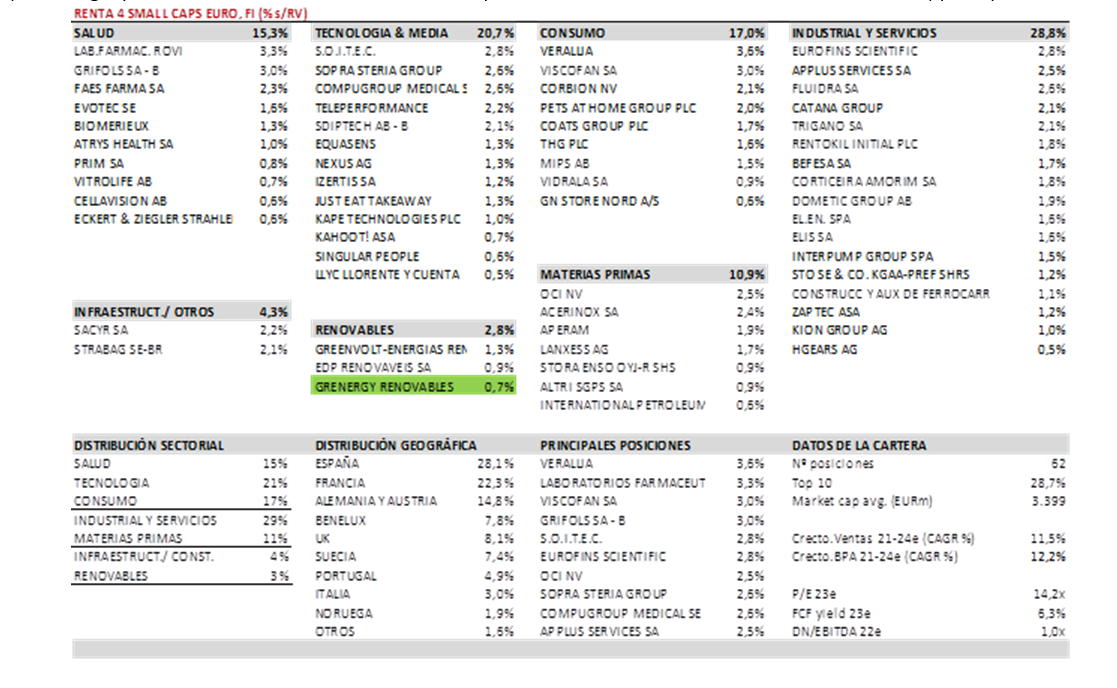 Respecto a movimientos, hemos dado salida a UCB, De Longhi y Sensient, donde vemos menor potencial de revalorización en el contexto actual. Por su lado, hemos aumentado peso en Compugroup (al 2,5%), Coats (al 1,7%), y hemos incorporado a la cartera a Grenergy (España, energías renovables, mkt cap 0,9bn EUR).