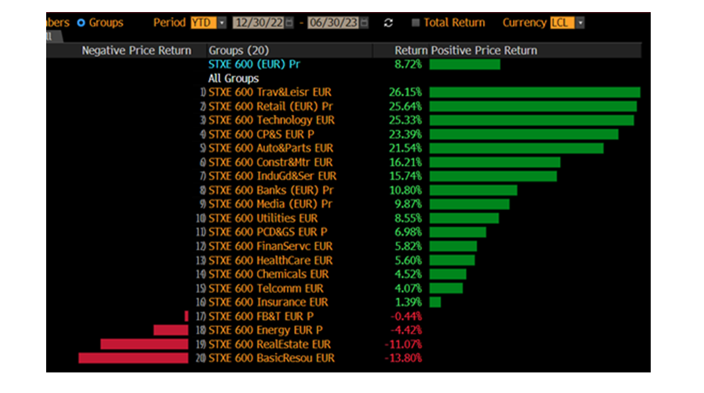 El primer semestre ha deparado sorpresas, con subidas del 16% en el Eurostoxx y el S&P, y del 37% en el Nasdaq, impulsado por las tecnológicas estadounidenses de gran capitalización. Es un escenario muy distinto al que muchos esperaban a finales del año pasado. Se han sorteado varias “minicrisis”, sin grandes correcciones, como la abrupta subida de tipos y mayor coste de capital, la tensión en bancos regionales de Estados Unidos, tensión en el sector inmobiliario comercial, y la menor renta disponible de consumidores a nivel global. Las expectativas del mercado de una recesión en 2023 son menores hoy que hace unos meses, en un mundo de alto empleo, solidos beneficios empresariales y baja volatilidad. Parece que el mercado descuenta que la inflación ha tocado techo, que ya se han producido recortes en estimaciones beneficios empresariales, y que los tipos se normalizarán más cerca del 4,0-4,5%, que del 5,5%, en un momento en el que la inteligencia artificial está creando nuevos focos de crecimiento / deflación, y los precios de la energía se han normalizado. En renta variable, se ha observado una rotación hacia liquidez, calidad, y gran capitalización (con peor comportamiento relativo de small caps). En Europa, los mejores sectores han sido tecnología (semiconductores y software principalmente), retail/lujo, y ocio/turismo, todos ellos con subidas por encima del 25%. Los peores, energía, materias primas y real state.