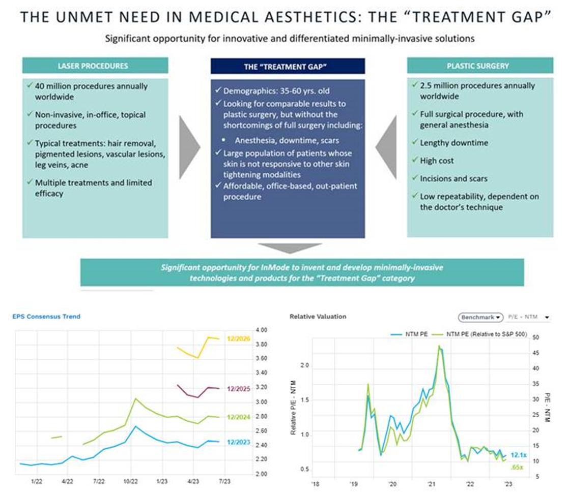Inmode es una empresa israelí de aparatología estética (cotizada en USA, market cap c.3,2bn USD). Desarrolla, fabrica y comercializa productos médicos estéticos mínimamente invasivos y no invasivos, dirigidos a una serie de procedimientos, como la reducción permanente del vello, el rejuvenecimiento de la piel facial, la reducción de arrugas, el tratamiento de la celulitis, el aspecto y la textura de la piel y las lesiones vasculares y pigmentadas benignas superficiales. Tienen un enfoque diferente a la competencia, tanto por el producto (posicionamiento en radio-frecuencia, más efectiva y eficiente, y menos cara que el láser), y por cobrar el precio íntegro del aparato al cliente (centros de estética, dermatólogos), y un precio muy razonable por el consumible (bajo vs. competencia) incentivando a sus clientes a que ofrezcan sus procedimientos el mayor número de veces posible (y rentabilicen así el equipo). Parte del management formaba parte de Cynosure (que fue vendida a Hologic en 2017, por 30x EV/EBITDA).