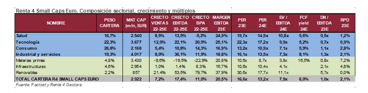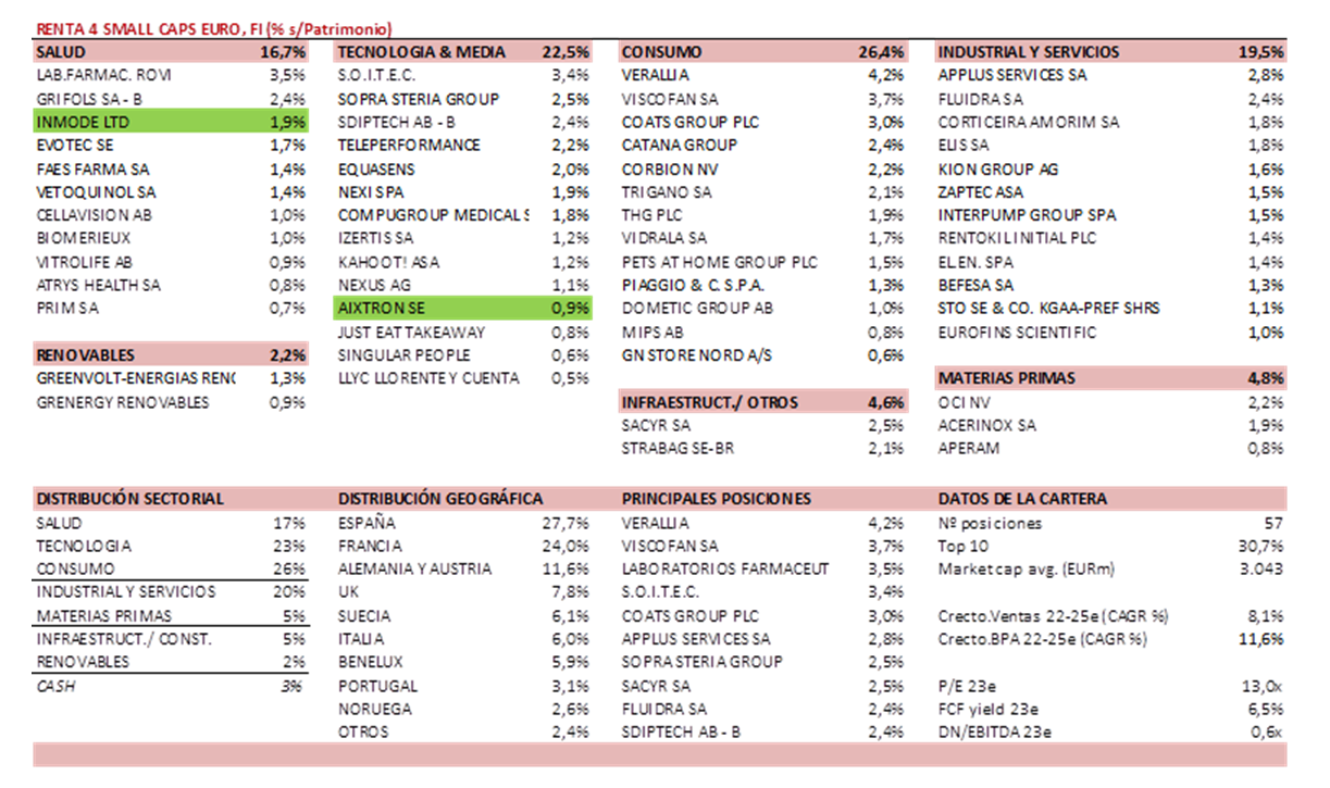 La cartera actual del Renta 4 Small Caps Euro está compuesta por 57 valores, con las primeras 10 posiciones representando un 31% del patrimonio. El posicionamiento se mantiene fiel a la política y filosofía del fondo. Alrededor de 2/3 de la cartera está en los sectores salud, tecnología y consumo, en compañías de alta calidad y crecimiento visible. Y el 1/3 restante en sectores industriales, servicios, materias primas e infraestructuras, donde vemos una infravaloración evidente, en compañías de calidad, líderes en su segmento.